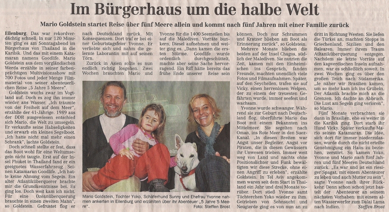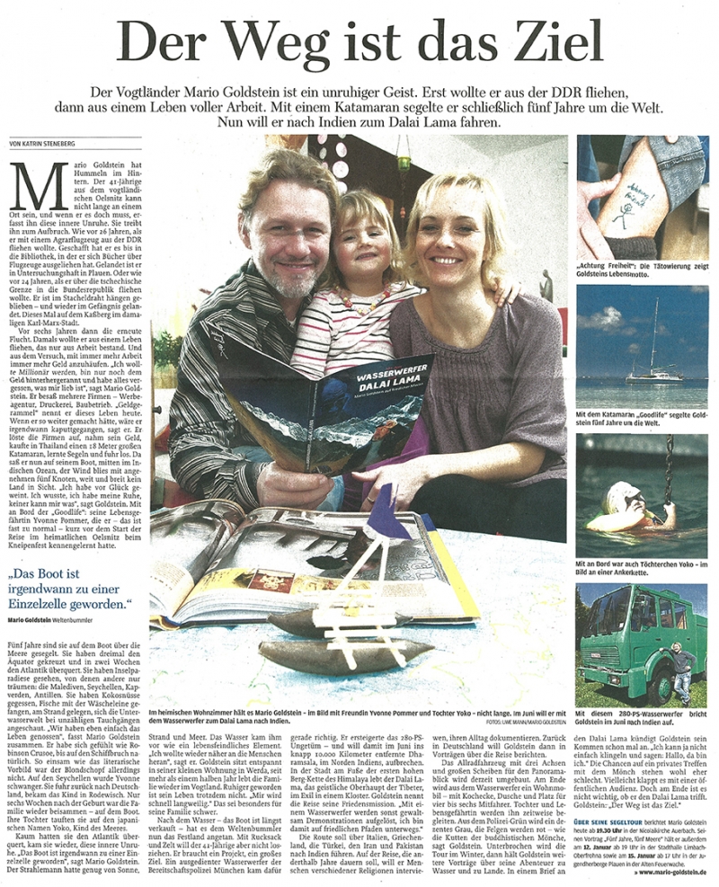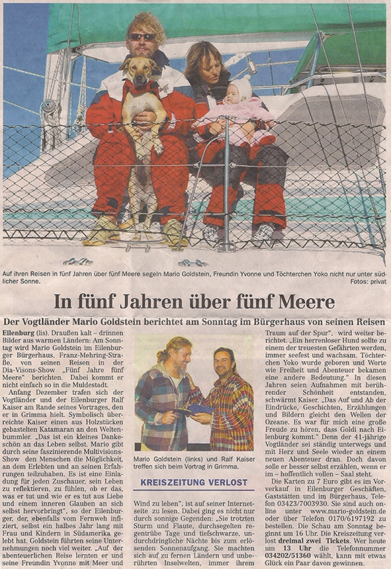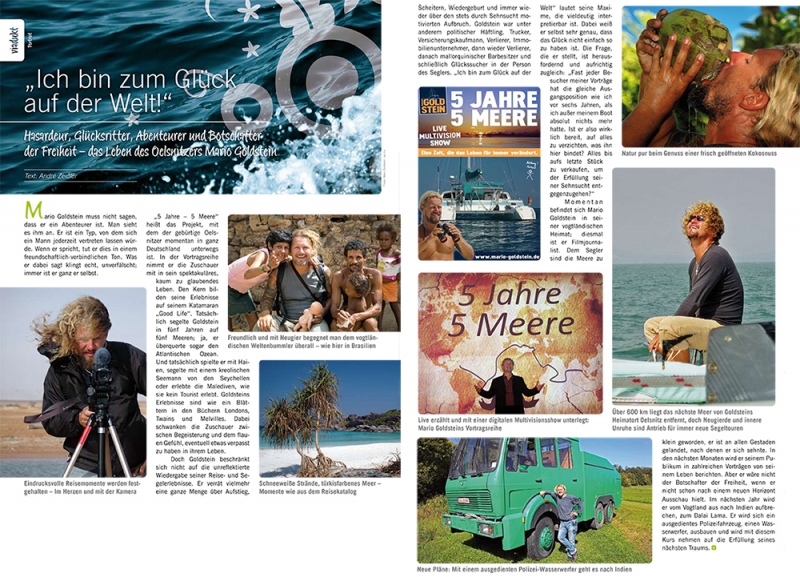 „5 Jahre – 5 Meere“ heißt das Projekt, mit dem der gebürtige Oelsnitzer momentan in ganz Deutschland unterwegs ist. In der Vortragsreihe nimmt er die Zuschauer mit in sein spektakuläres kaum zu glaubendes Leben. Den Kern bilden seine Erlebnisse auf seinem Katamaran „Good Life“. Tatsächlich segelte Goldstein in fünf Jahren auf fünf Meeren; ja, er überquerte sogar den Atlantischen Ozean.