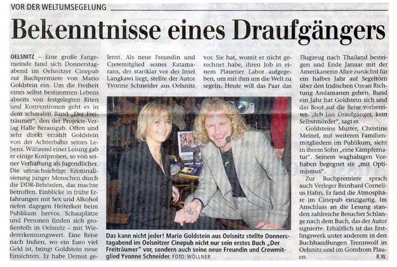 Das kann nicht jeder! Mario Goldstein aus Oelsnitz stellte Donnerstagabend im Oelsnitzer Cinepub nicht nur sein erstes Buch "Der Freiträumer" vor, sondern auch seine neue Freundin und Crewmitglied Yvonne Schneider.