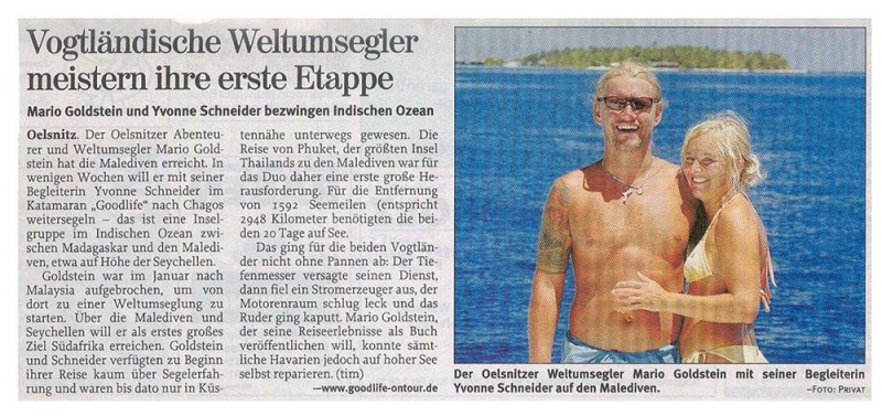 Der Oelsnitzer Abenteurer und Weltumsegler Mario Goldstein hat die Malediven erreicht. In wenigen Wochen will er mit seiner Begleiterin Yvonne Schneider im Katamaran "Goodlife" nach Chagos weitersegeln ...