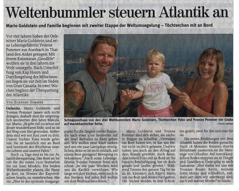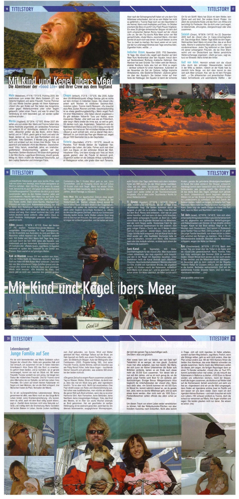 Als sie sich kennenlernten, war Mario Goldstein schon Skipper der "Good Life". Hatte sein gesammtes Hab und Gut verkauft, um zusammen mit der in Italien lebenden Amerikaner Alice Davice das Boot zu erwerben. Es gehört ihnen beiden und je nachdem, wo er gerade herumsegelt, kommt sie mal ein Stück mit. Mit seiner Freundin Yvonne versteht sie sich prima, hat längst schon den Status einer mütterlichen Freundin. Und für Yvonne stand eine Alternative nie zur Debatte, sie teilt das Leben ihres Freundes. Ein Leben auf einem kleinen Katamaran mit Segel und zwei Motoren, der um die Welt schippert, drei Menschen haben da Platz. Nomaden der Meere. ...