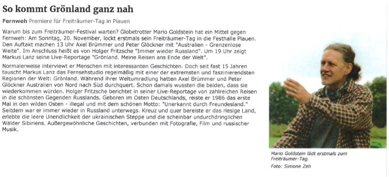Fernweh Premiere für Freiträumer-Tag in Plauen. Mario Goldstein lädt erstmals zum Freiträumer-Tag am 19.11.2016.