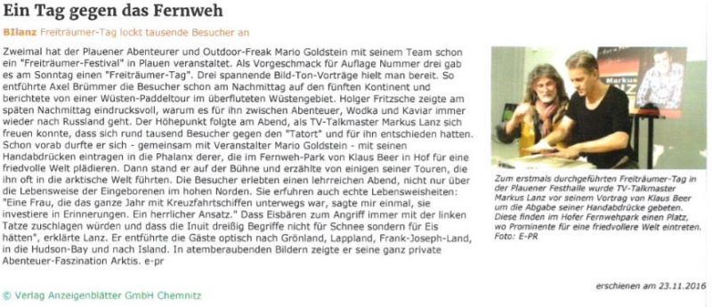 Zum erstmals durchgeführten Freiträumer-Tag om der Plauene Festhalle wurde TV-Talkmaster Markus Lanz vor seinem Vortrag von Klaus Beer um die Abgabe seiner Handabdrücke gebeten. Diese finden im Hofer Fernwehpark einen Platz, wo Prominente für eine friedvolle Welt eintreten.