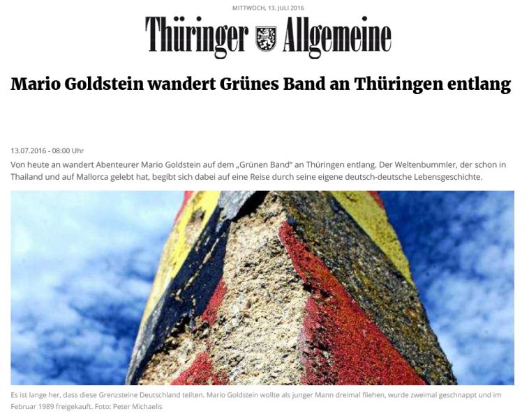 Von heute an wandert Abenteurer Mario Goldstein auf dem „Grünen Band“ an Thüringen entlang. Der Weltenbummler, der schon in Thailand und auf Mallorca gelebt hat, begibt sich dabei auf eine Reise durch seine eigene deutsch-deutsche Lebensgeschichte.